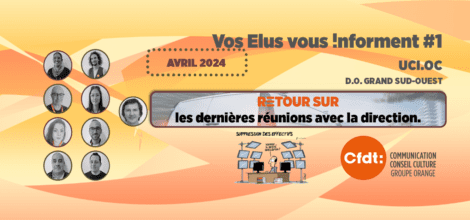 Avril 2024 - La CFDT Orange UCI Occitanie aborde les politiques sur les véhicules d'entreprise, la réduction des effectifs, les projets immobiliers et les réponses syndicales aux décisions de la direction.