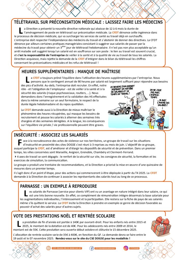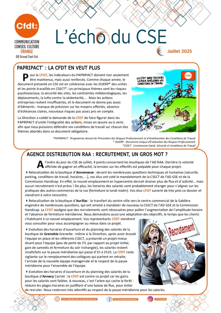 Il s’agit donc d’un point d’étape, pour des actions qui commenceront à être déployée à partir du T4 2025. La CFDT demande à la Direction de continuer à associer les représentants des salariés tout au long de ce processus.