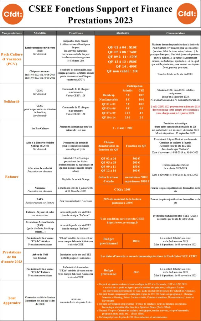 Un budget ASC 2023 présenté par la CFDT, avec des prestations en hausse et redistribué à 100% à l’ensemble des salariés incluant des prestations mutualisées (Inter-CSE) avec le CSEC. Avec la CFDT, toujours plus d’actions, de propositions, partout pour tous.