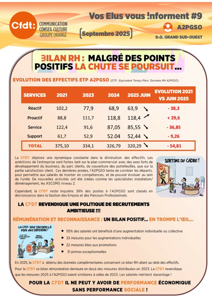 La CFDT déplore une dynamique constante dans la diminution des effectifs. Les ambitions de l’entreprise sont fortes tant sur le plan commercial avec des axes forts de développement du business, du parc clients, de couverture des portefeuilles, que sur la partie satisfaction client. Ces dernières années, l’A2PGSO tente de combler les départs, pour permettre aux salariés de monter en compétences, et de pouvoir évoluer au sein de l’unité. De nouvelles activités ont été créées comme les spécialistes installation/déménagement, les ASCOMS niveau 2.