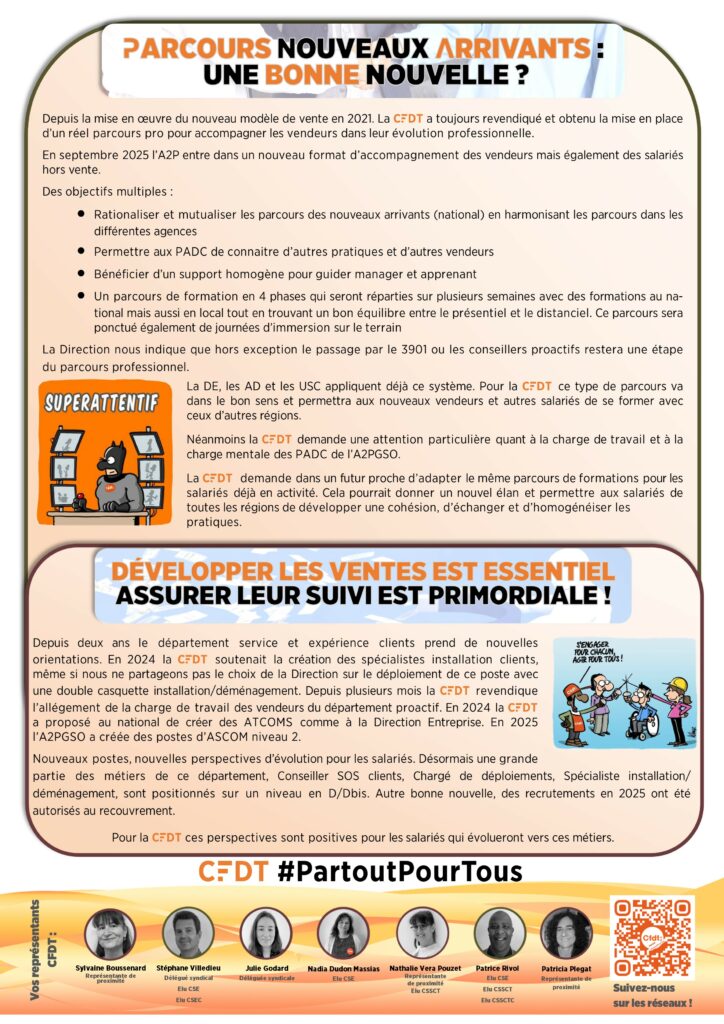 Depuis deux ans le département service et expérience clients prend de nouvelles orientations. En 2024 la CFDT soutenait la création des spécialistes installation clients, même si nous ne partageons pas le choix de la Direction sur le déploiement de ce poste avec une double casquette installation/déménagement. Depuis plusieurs mois la CFDT revendique l’allégement de la charge de travail des vendeurs du département proactif. En 2024 la CFDT a proposé au national de créer des ATCOMS comme à la Direction Entreprise. En 2025 l’A2PGSO a créée des postes d’ASCOM niveau 2.